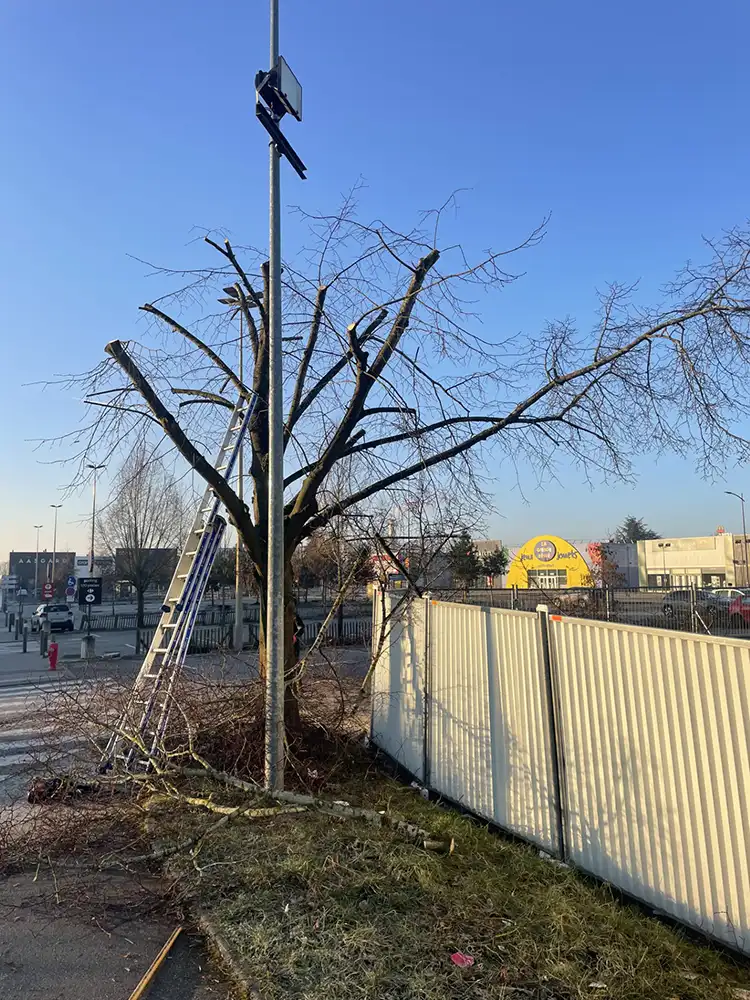 Travailler sur le parking d’un établissement comme Go Sport impose une logistique sans faille. Aubert Elagage a mis en place un balisage strict pour sécuriser le périmètre d’intervention. Une fois l’élagage terminé, nous avons procédé à l’évacuation complète des rémanents et au nettoyage de la zone de travail pour un rendu impeccable.